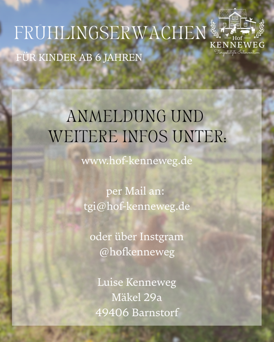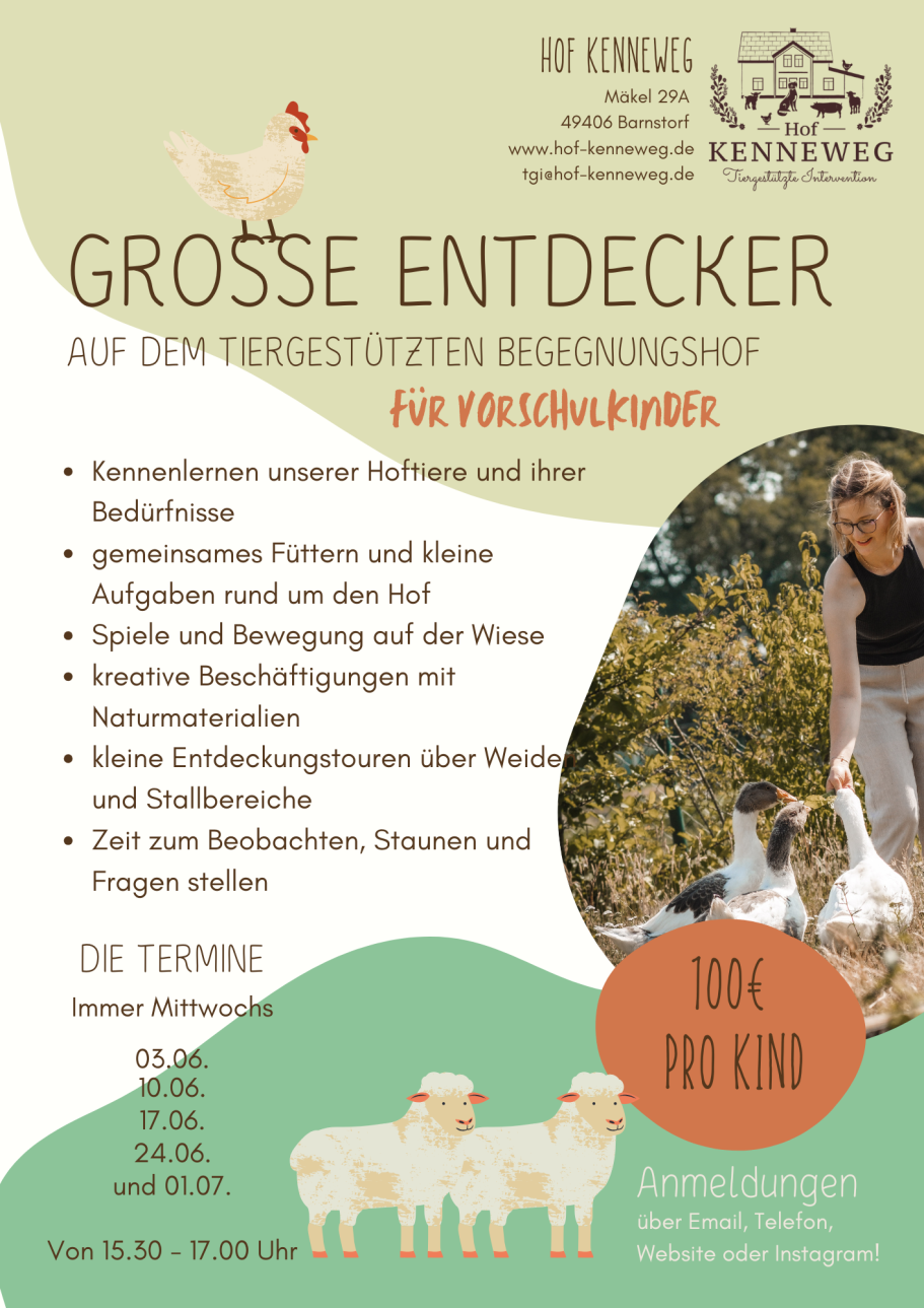 Dieser Kurs richtet sich an Vorschulkinder, die unseren Begegnungshof in einer kleinen, festen Gruppe kennenlernen möchten. Wir gehen auf kleine Erkundungstouren über die Weiden und beschäftigen uns spielerisch und kreativ mit dem Leben auf dem Hof. Dabei stehen Freude an der Natur, achtsame Begegnungen mit den Tieren und gemeinsames Erleben im Mittelpunkt.