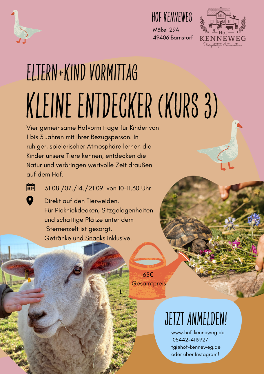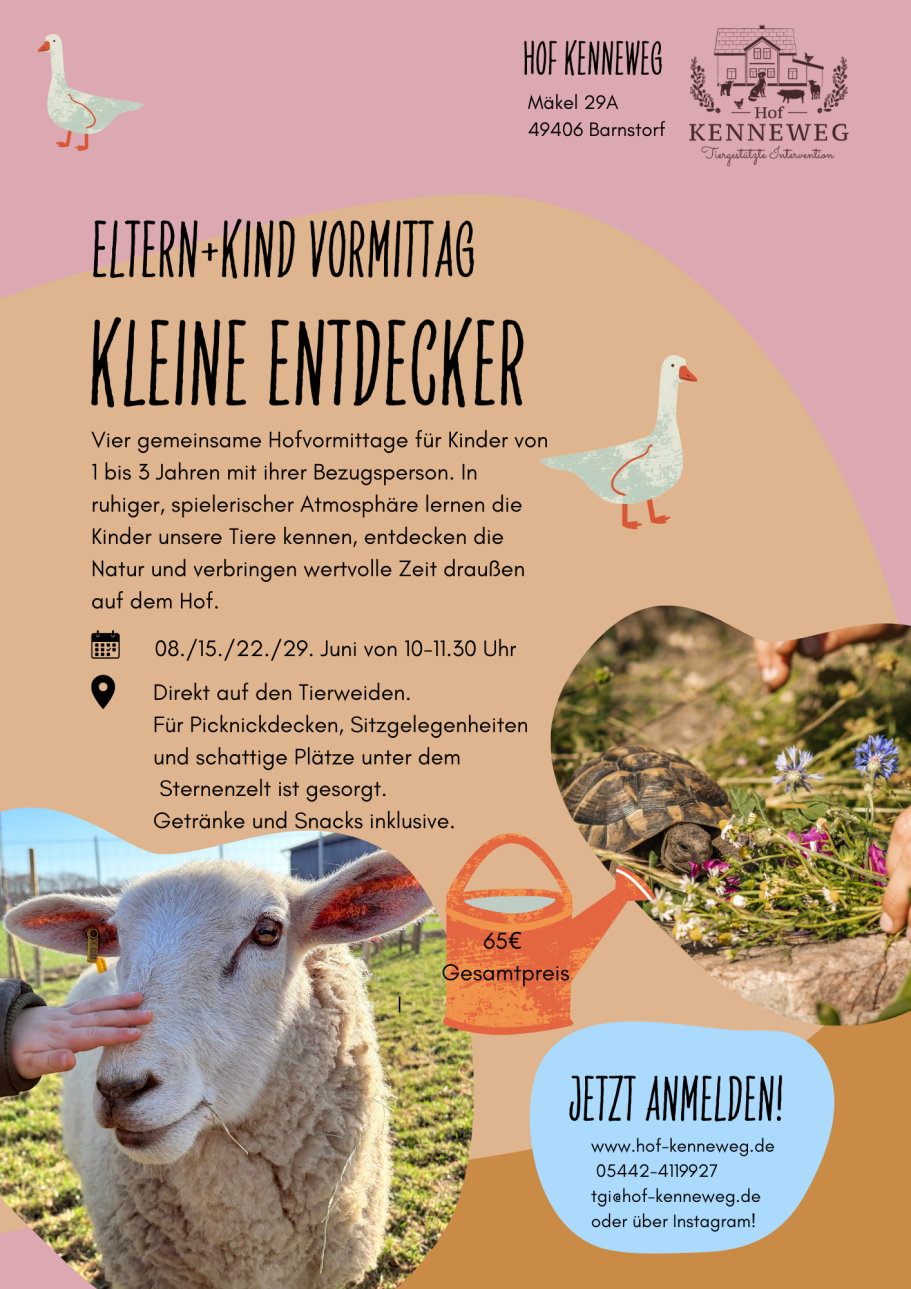 Dieses Angebot richtet sich an Kinder im Alter von 1 bis 3 Jahren, die gemeinsam mit ihrer Bezugsperson unseren Begegnungshof entdecken möchten. In einer kleinen, festen Gruppe verbringen wir vier entspannte Vormittage draußen auf den Weiden und bei den Tieren. Die Kinder dürfen beobachten, sich frei bewegen, spielen und erste Begegnungen mit unseren Hoftieren erleben.