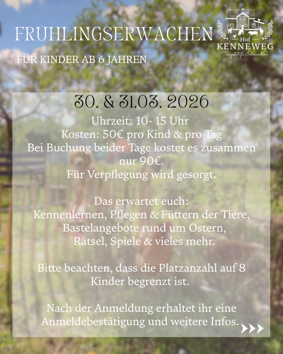 In unserem Ferienprogramm erleben Kinder einen abwechslungsreichen Tag rund um Tiere und Kreativität. Gemeinsam lernen wir die Tiere kennen, kümmern uns um ihre Pflege und Fütterung und entdecken spielerisch Wissenswertes aus der Tierwelt. Ergänzt wird das Programm durch Bastelangebote rund um Ostern, Rätsel und weitere Spiele.